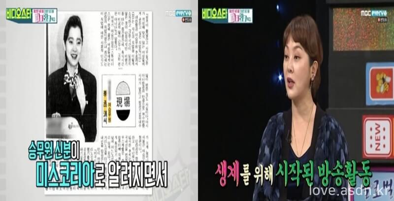 승무원 시절 1992년 새리미용실 이훈숙 원장님의 권유로 미스코리아 대회에 나가게 되면서 해고와 동시에 승무원 생활은 종지부를 찍었다고 합니다.